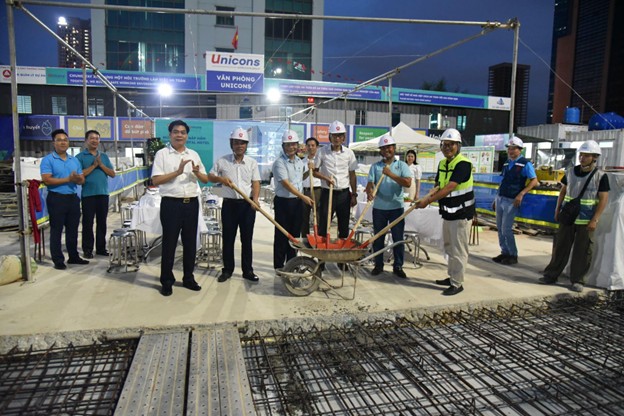 Vào lúc 18h hơn, trong khoảnh khắc đáng nhớ của buổi lễ, Ban Lãnh đạo Phương Thành Tranconsin và đại diện nhà thầu Unicons đã thực hiện nghi thức xúc những xẻng bê tông đầu tiên, chính thức khép lại quá trình thi công tầng hầm và chuyển sang giai đoạn xây dựng phần thô trên cao.