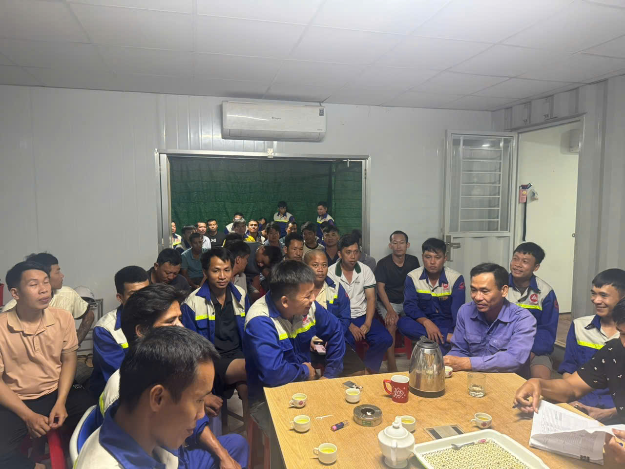 Các cán bộ kĩ thuật và công nhân công trình đều nghiêm túc lắng nghe thầy giảng trực tuyến để nắm bắt nội dung trọng tâm.