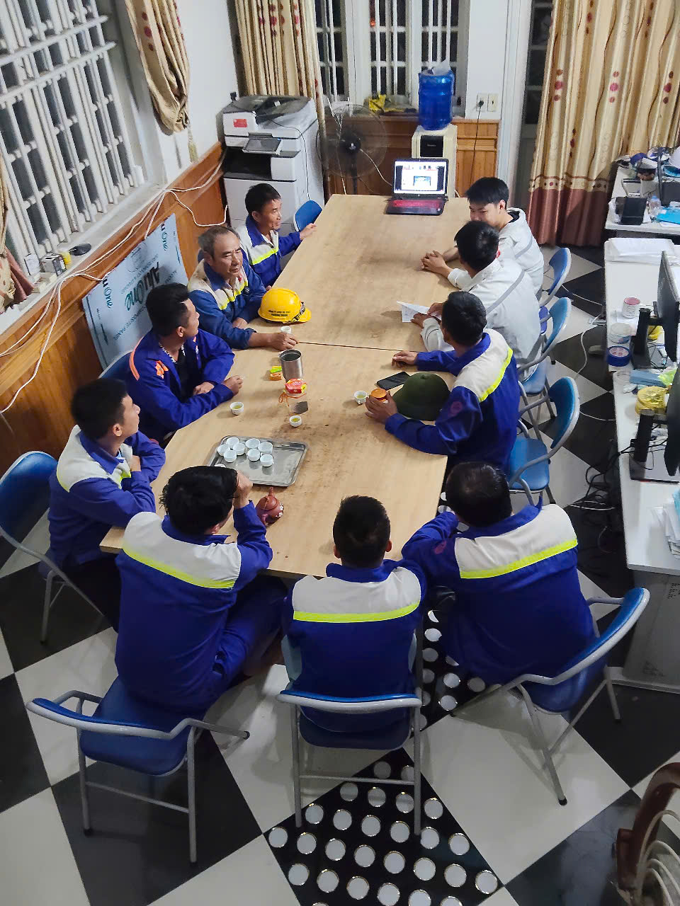 Các cán bộ kĩ thuật và công nhân công trình đều nghiêm túc lắng nghe thầy giảng trực tuyến để nắm bắt nội dung trọng tâm.