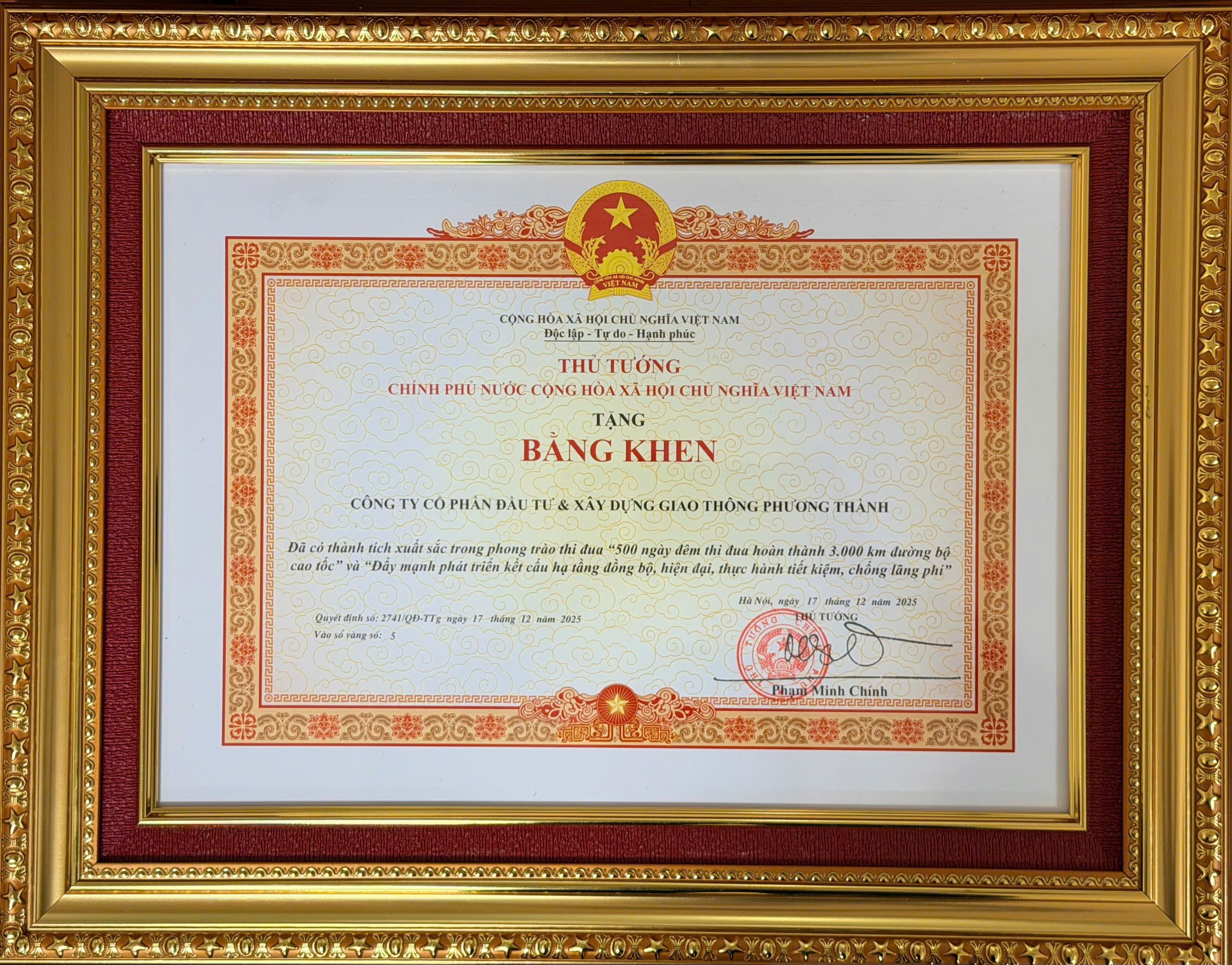 Bằng khen của Thủ tướng Chính phủ không chỉ là vinh dự lớn lao mà còn là sự ghi nhận xứng đáng cho những nỗ lực, cống hiến không ngừng nghỉ của toàn thể cán bộ, nhân viên (CBNV) Phương Thành Tranconsin. Thành tích này càng khẳng định năng lực, tinh thần trách nhiệm và sự đồng lòng của tập thể Phương Thành trong việc hiện thực hóa các mục tiêu phát triển hạ tầng giao thông trọng yếu của quốc gia, góp phần thúc đẩy kinh tế – xã hội đất nước.
