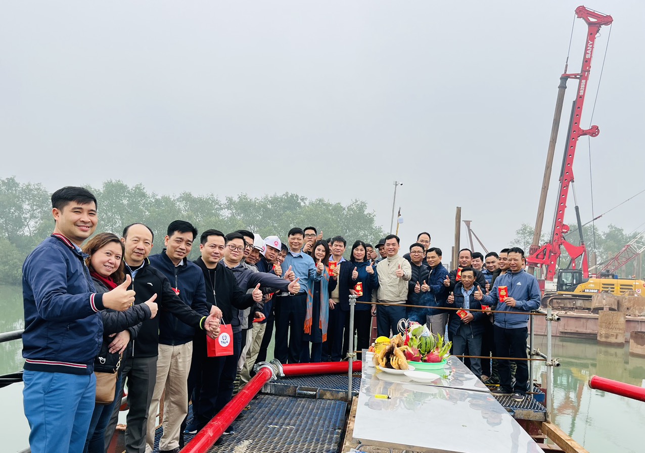 Đoàn đến thăm và chúc tết công trường cầu Sông Rút thuộc dự án XD đường ven sông tỉnh Quảng Ninh. TGĐ chúc tết và mừng tuổi từng người lao động trên công trường, từ các lãnh đạo BĐH tới từng cán bộ kỹ thuật và anh em công nhân đã bắt đầu những ngày làm việc đầu tiên của năm mới Nhâm Dần. Sau khi làm lễ đầu năm trên công trường, TGĐ đã có những yêu cầu tiến độ tháng 2/2022 như : Hoàn thành thi công cọc khoan nhồi dưới sông trước 20/2/2022, hoàn thành đổ bê tông bịt đáy trụ T8, bơm cát mặt bằng phía M2.