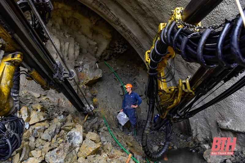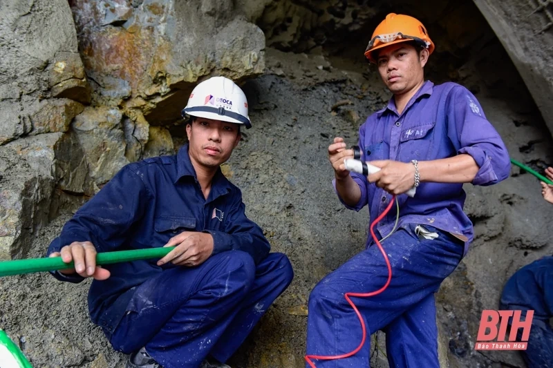 Công nhân đang kiểm tra chuẩn bị nổ mìn thi công Hầm Thung Thi, huyện Hà Trung, tỉnh Thanh Hóa.