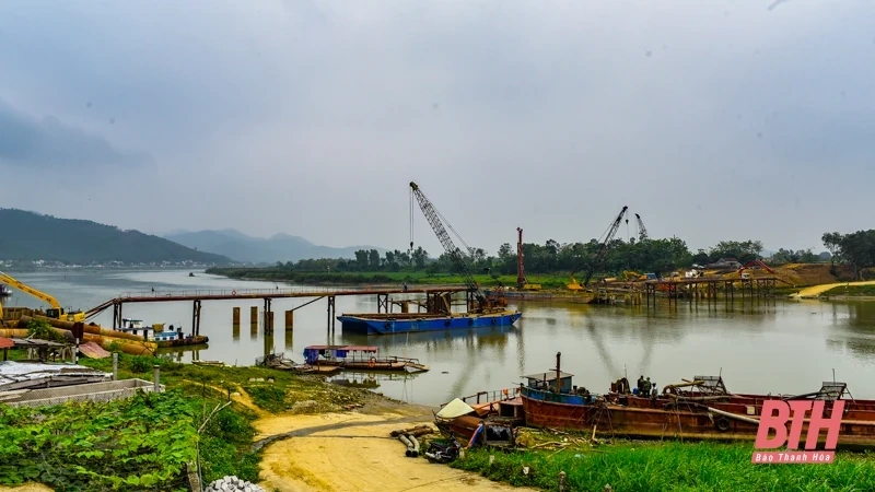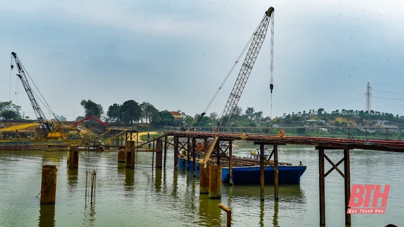 Toàn cảnh công trường thi công hạng mục cầu Vĩnh An vượt sông Lèn (Thanh Hoá) với chiều dài là 475m.