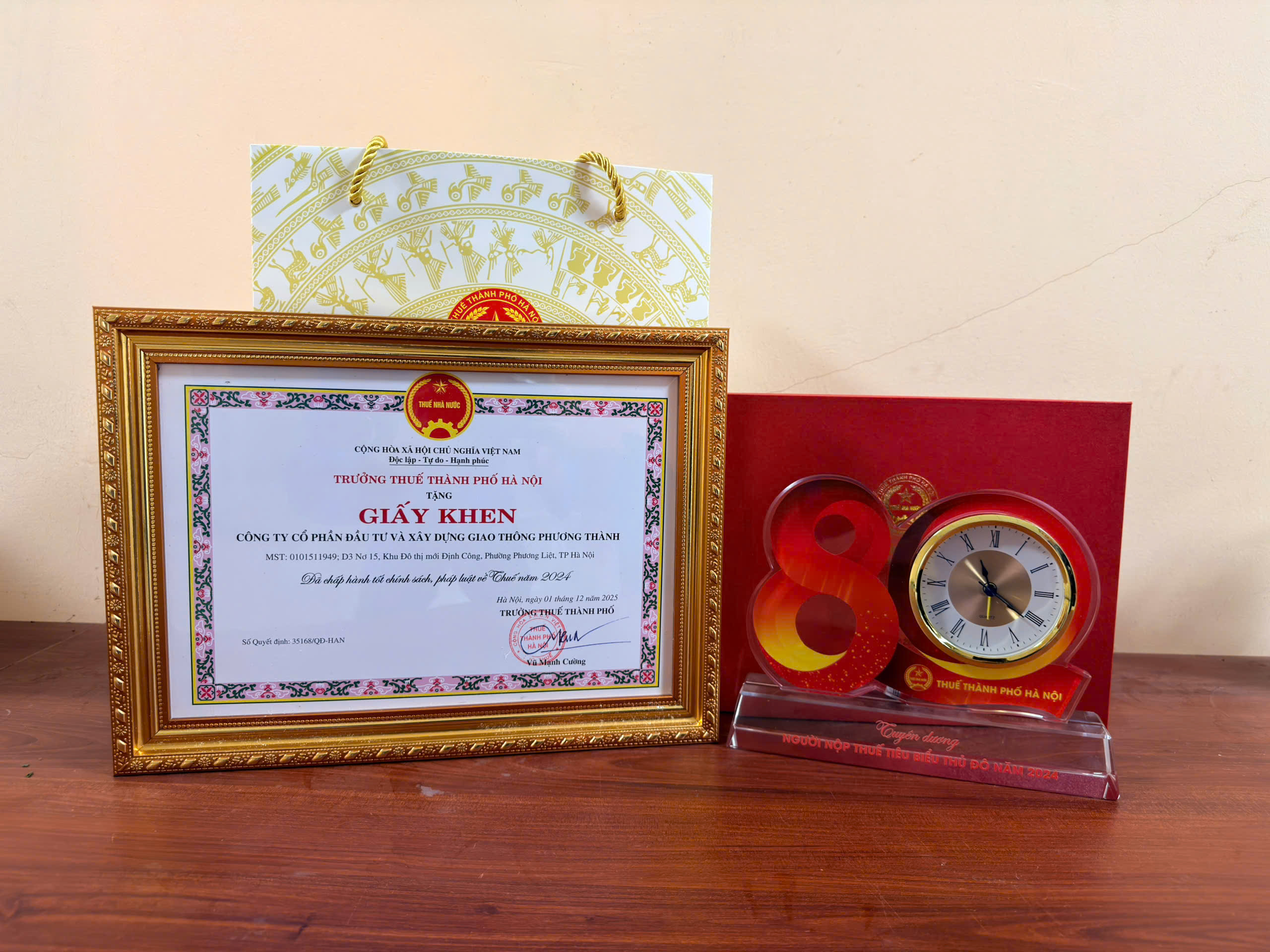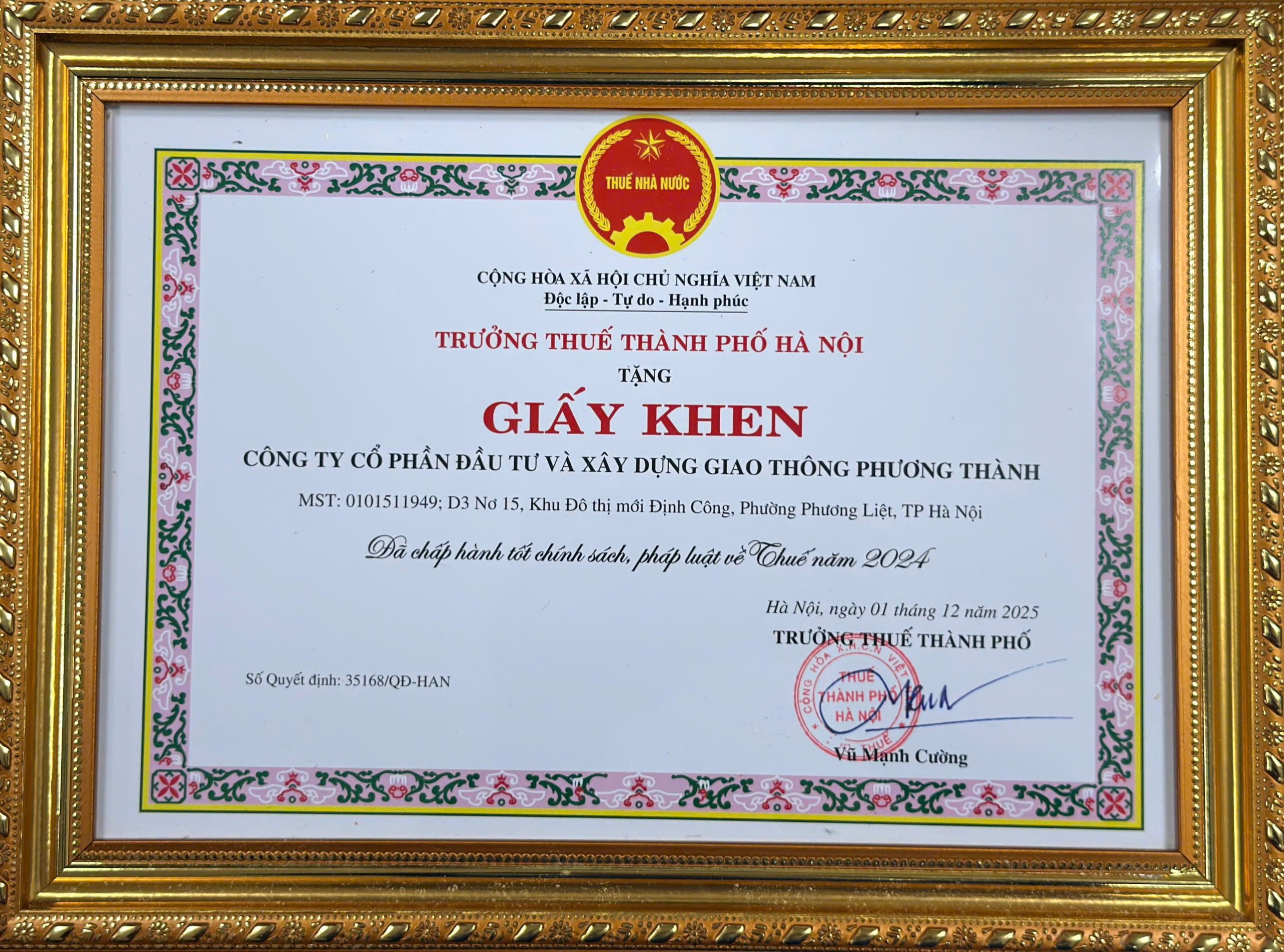 Chiều ngày 22/12, tại Hội nghị tuyên dương người nộp thuế tiêu biểu Thủ đô năm 2024 (tính theo năm tài chính), Cục Thuế TP. Hà Nội đã vinh danh 170 doanh nghiệp và cá nhân tiêu biểu. Công ty Cổ phần Đầu tư và Xây dựng giao thông Phương Thành vinh dự nằm trong số những đơn vị được nhận Giấy khen vì thành tích “Chấp hành tốt chính sách, pháp luật về Thuế năm 2024”.