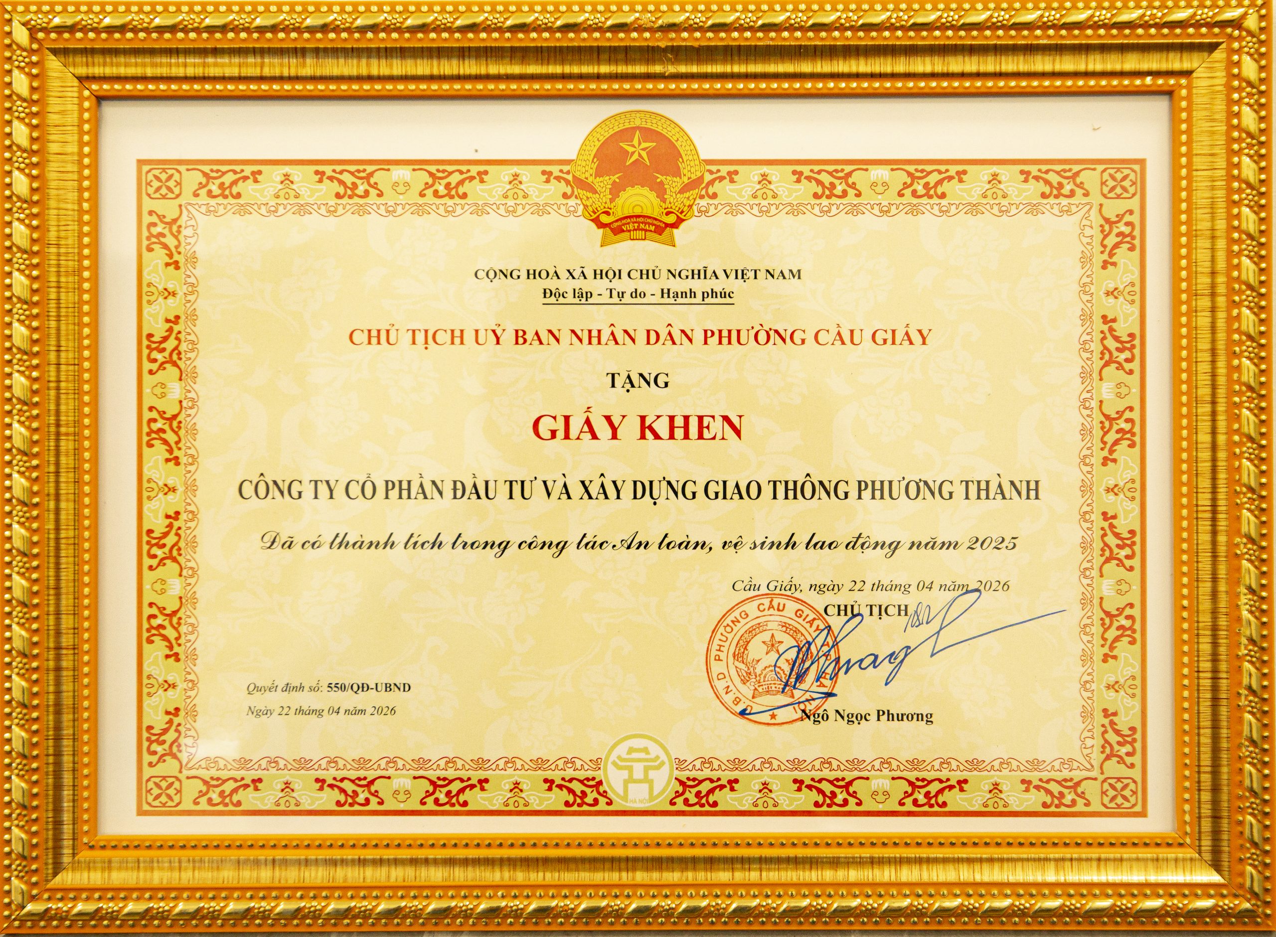 Ngày 23/4/2026, Công ty Cổ phần Đầu tư và Xây dựng Giao thông Phương Thành (Phương Thành Tranconsin) đã được Chủ tịch UBND phường Cầu Giấy trao tặng Giấy khen cho tập thể có thành tích trong công tác an toàn, vệ sinh lao động (ATVSLĐ) năm 2025 theo Quyết định số 550/QĐ-UBND ngày 22/4/2026.