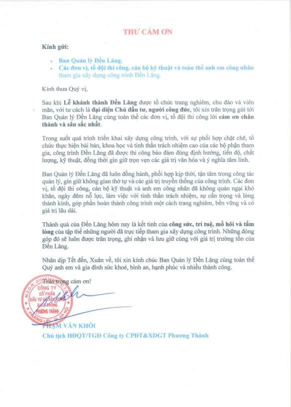 Đây là dịp để Công ty Phương Thành ghi nhận và bày tỏ lòng biết ơn đến những đóng góp quý báu của các tập thể, cá nhân. Thành quả Đền Lăng hôm nay chính là sự kết tinh từ công sức, trí tuệ, mồ hôi và tấm lòng nhiệt huyết của những người đã trực tiếp tham gia thi công.