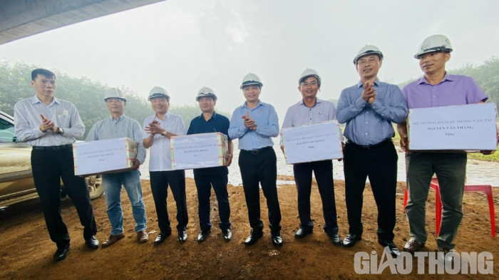 Bộ trưởng Nguyễn Văn Thắng tặng quà động viên tinh thần các công nhân tại công trường.